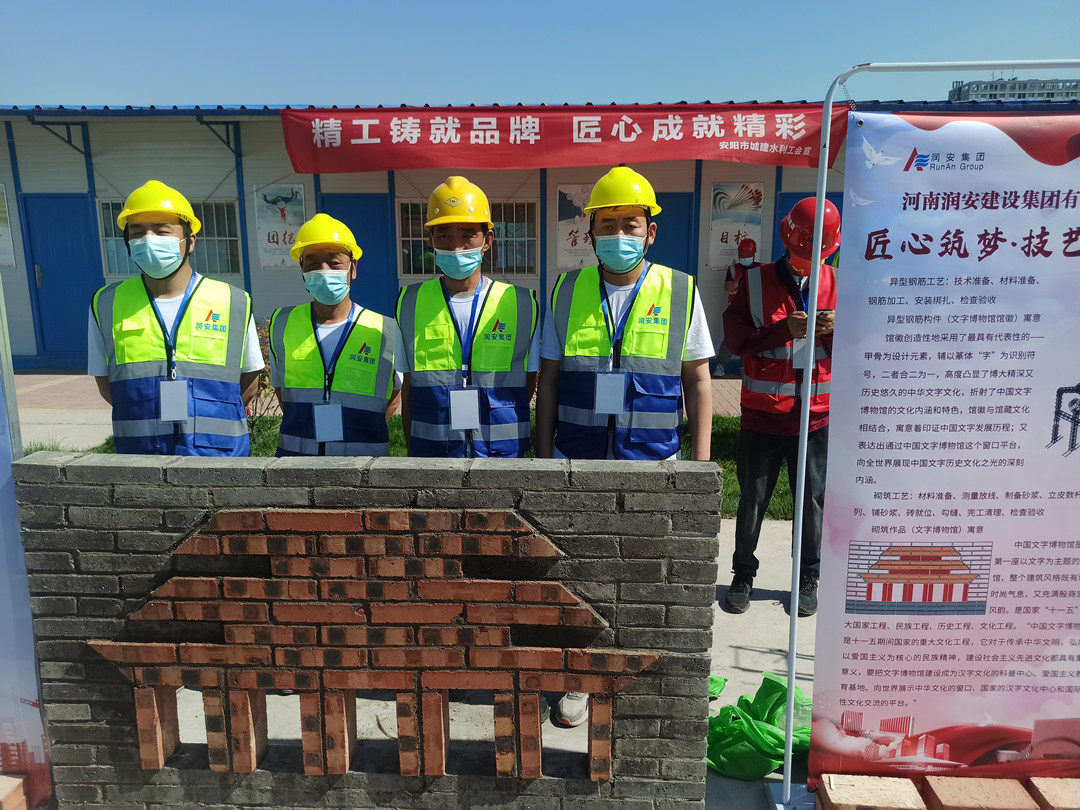 本次技能展示活動設置了鋼筋綁扎和砌筑兩個項目,我公司派遣八名職工代表參加了本次技能展示,選手們身著統(tǒng)一工作服,以嫻熟的操作技能展現(xiàn)了過硬的技術水平。砌筑工速度與質量并重,一手拿著泥刀,一手不停地一塊塊砌磚,每一道工序、每一個細節(jié)都力求做到完美,最終圓滿完成了砌筑作品《文字博物館》。鋼筋工粗中有細,在大面積作業(yè)的同時,即時進行細節(jié)處理,確保作品垂直、平整,經(jīng)過一系列的復雜操作,一個完美的安陽文字博物館館徽便呈現(xiàn)在眼前。高超的技藝水平贏得了領導和現(xiàn)場觀眾的一致稱贊。