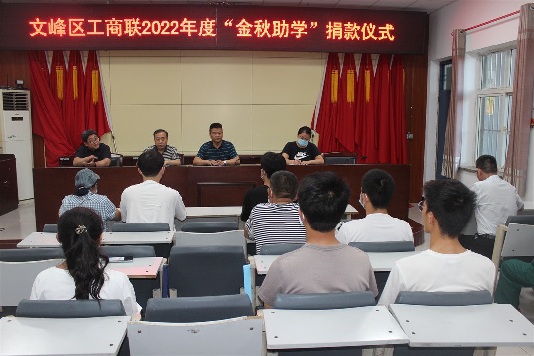 感動(dòng)的場(chǎng)面,讓莘莘學(xué)子沐浴著春天里的陽(yáng)光;捐贈(zèng)的雙手,讓貧困家庭感受到春天般的溫暖。為幫助2022年度貧困大學(xué)新生順利入學(xué),文峰區(qū)工商聯(lián)于8月23日下午在文峰區(qū)政府二樓會(huì)議室舉行2022年文峰區(qū)工商聯(lián)、慈善總會(huì)“金秋助學(xué)”捐款儀式,文峰區(qū)委常委、統(tǒng)戰(zhàn)部長(zhǎng)王悅,副區(qū)長(zhǎng)湯鵬,政協(xié)副主席、工商聯(lián)主席朱艷麗,工商聯(lián)名譽(yù)主席田運(yùn)海,慈善總會(huì)副會(huì)長(zhǎng)郭獻(xiàn)臣,民政局主任程治民出席了今天捐助儀式。捐助儀式由統(tǒng)戰(zhàn)部副部長(zhǎng)、工商聯(lián)黨組書(shū)記李海平書(shū)記主持。